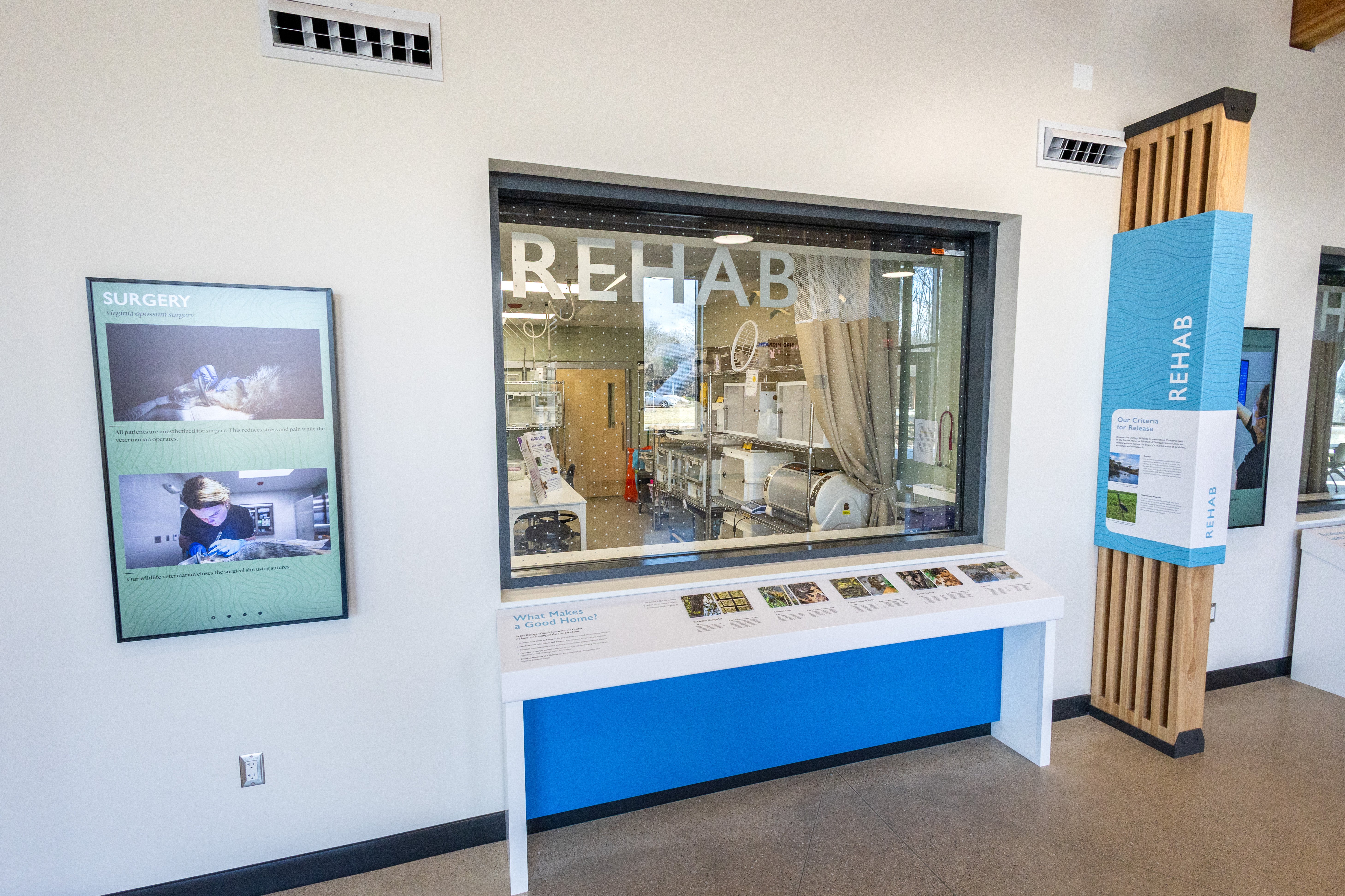 DuPage Wildlife Conservation Center offers a behind-the-scenes look at real-time wildlife rehabilitation. Viewing windows allow visitors to watch exams, surgeries, and, during certain seasons, baby animals being cared for in the new facility.