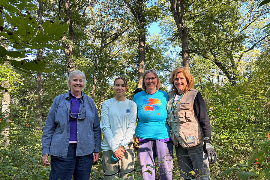 Volunteer steward Grey, Votava, her mother Margaret Votava, and volunteer co-steward Mary Pieters enjoy a recent workday at Danada Forest Preserve.