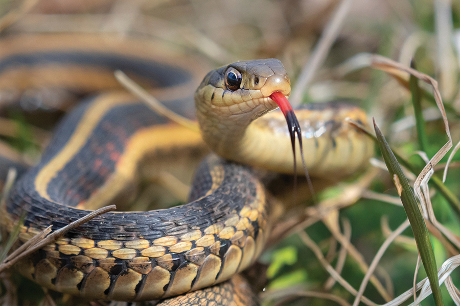 This eastern garter snake is using its forked tongue to pull chemicals from the air to locate prey.